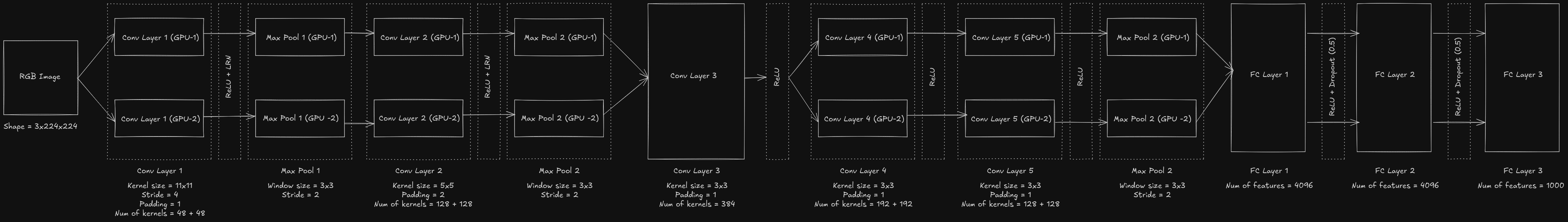 The above image shows the complete end-to-end architecture of AlexNet, which contains 5 convolutional layers and 3 fully-connected layers. Let’s break it down into simple chunks.