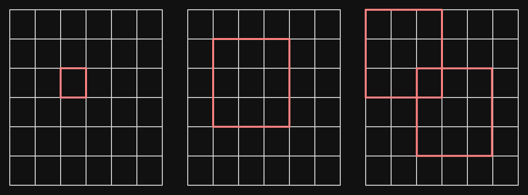The receptive field of a particular neuron in a particular layer of a CNN is the region of input image which the neuron is “able to see” i.e. which affects the activation of that neuron. Consider two convolutional layers with kernel size of 3x3, padding of 1 and stride of 1, which are applied to a 6x6 input image. The size of the final image is 6x6. The value of each neuron in the final image is dependent on a window of size 3x3 on the previous layer but each neuron in that layer is again dependent on a window of size 3x3 on the input layer i.e. each neuron in the final image sees the input image through a window of size 5x5. The receptive field of that neuron becomes 5x5 and the receptive field keeps increasing for the neurons in the deeper layers of the network.