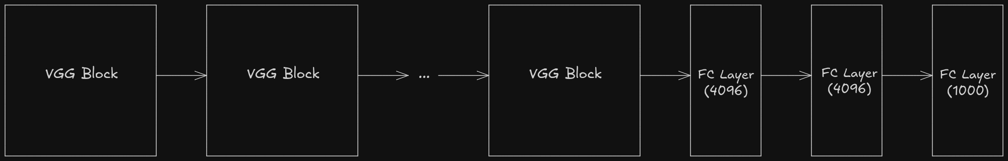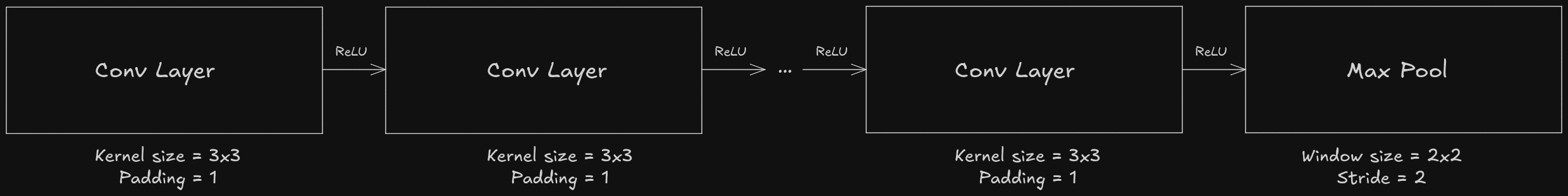 The architecture of a VGGNet can be simplified down into stack of “VGG blocks” and each VGG block could be represented as series of convolutional layers with kernel size of 3x3 and padding of 1 with ReLU in between each and a max pooling layer at the end.