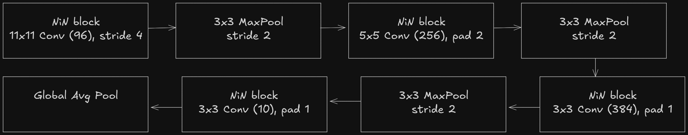and the architecture proposed in NiN’s paper can be represented as follows, instead of alternating convolutional and pooling layer, it has alternating NiN blocks and pooling layers.
