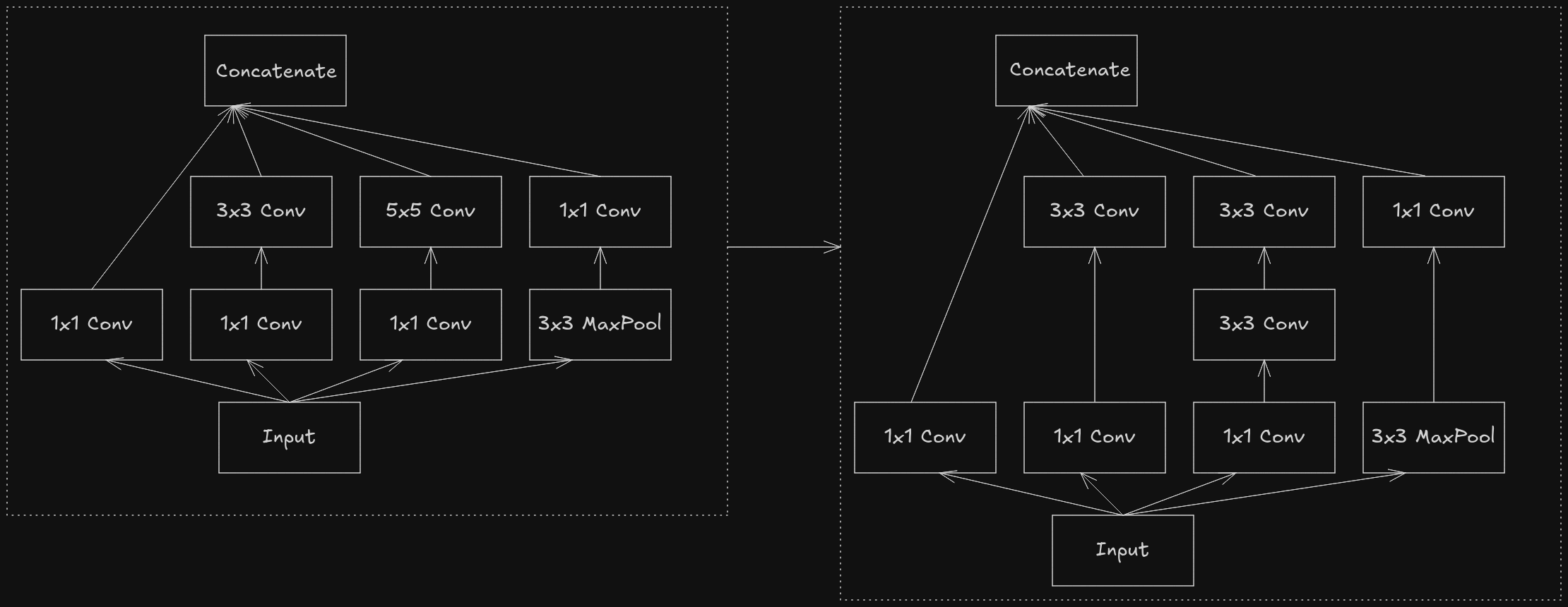 The above architecture was originally presented in the paper and it is often called as Inception V1. Later, a follow-up paper titled Rethinking the Inception Architecture for Computer Vision proposed quite a few improvements to the original Inception module architecture.