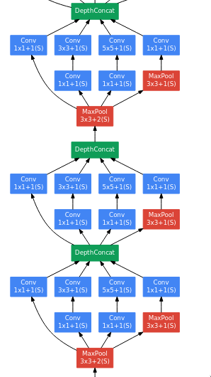 The next series of layers are just three inception module blocks placed next to each other with a max pooling layer just before the last block.