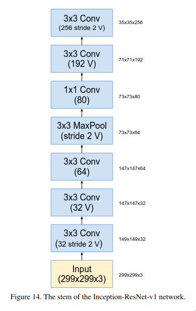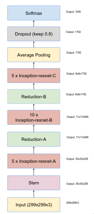 The above image is entire network design of Inception-ResNet-v1. It has a couple of building blocks like “Stem”, “Inception-ResNet-A”, “Reduction-A”, “Inception-ResNet-B”, “Reduction-B” and “Inception-ResNet-C”.