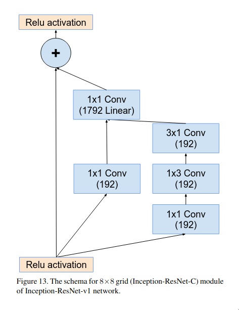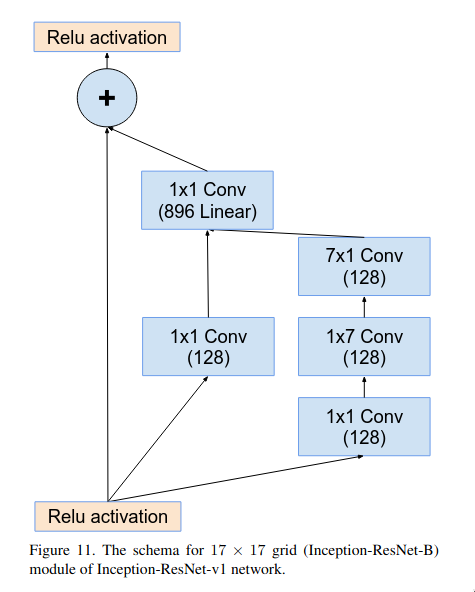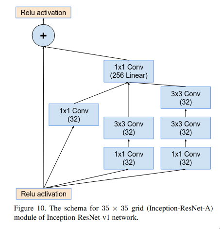 The high level difference between a plain Inception block and a Inception-ResNet block is that instead of concatenation, summation operation is used and a skip connection is present. The paper proposed two network designs - Inception-ResNet-v1 (roughly the computational cost of Inception-v3) and Inception-ResNet-v2 (roughly the computational cost of Inception-v4) . Let’s go through the Inception-ResNet-v1.