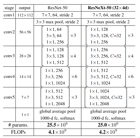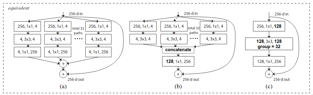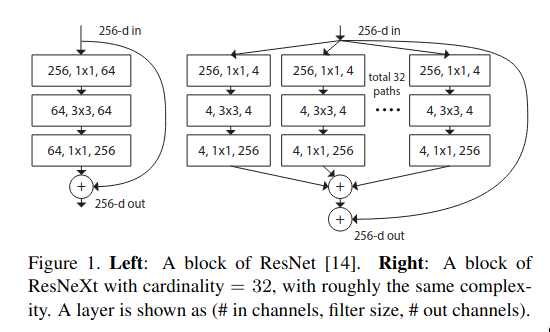 The above image shows the differences between the bottleneck block in ResNet and a basic ResNeXt block. The ResNeXt block has multi-branch setup like Inception, even though the structure for each branch is the same - the weights and biases are the different so they can learn different features. At the end, the results from all of the parallel paths are aggregated via summation. ResNeXt introduces a new dimension known as “cardinality” - the number of parallel paths. The author of the paper argue that cardinality is an essential dimension and can be more effective than depth and width of the network.
