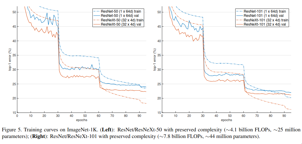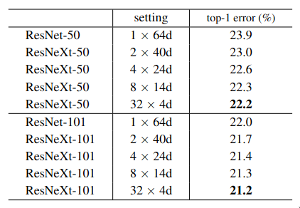 One of the experiments conducted by the authors was to evaluate the tradeoff between cardinality and width. They chose two types of networks - 50 layered and 101 layered, and evaluated the tradeoff between the traditional ResNet and ResNeXt by increasing the cardinality while keeping the total complexity cost constant.